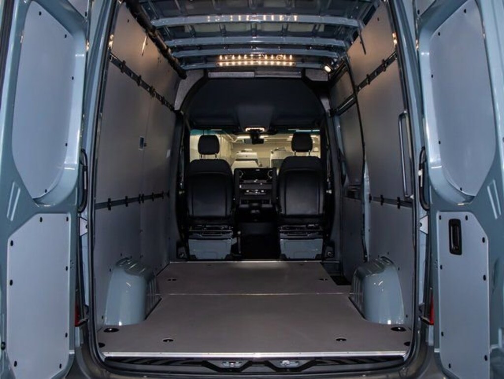 Inside, the Sprinter offers an immersive experience with premium amenities such as leatherette upholstery and a leather steering wheel. The driver and co-driver seats include lumbar support and heated options for comfort. Additional features like an overhead console, illuminated entry, and a user-friendly MBUX Multimedia System with a 10.25 touchscreen provide modern convenience.